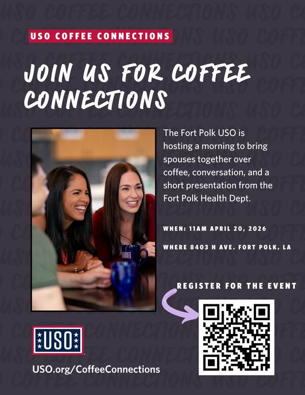 The USO hosted a morning to bring spouses together over coffee, conversation, and a short presentation from the Fort Polk Health Dept. Volunteers will help serve coffee, assist with activities, and create a welcoming environment for everyone attending.